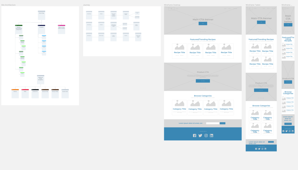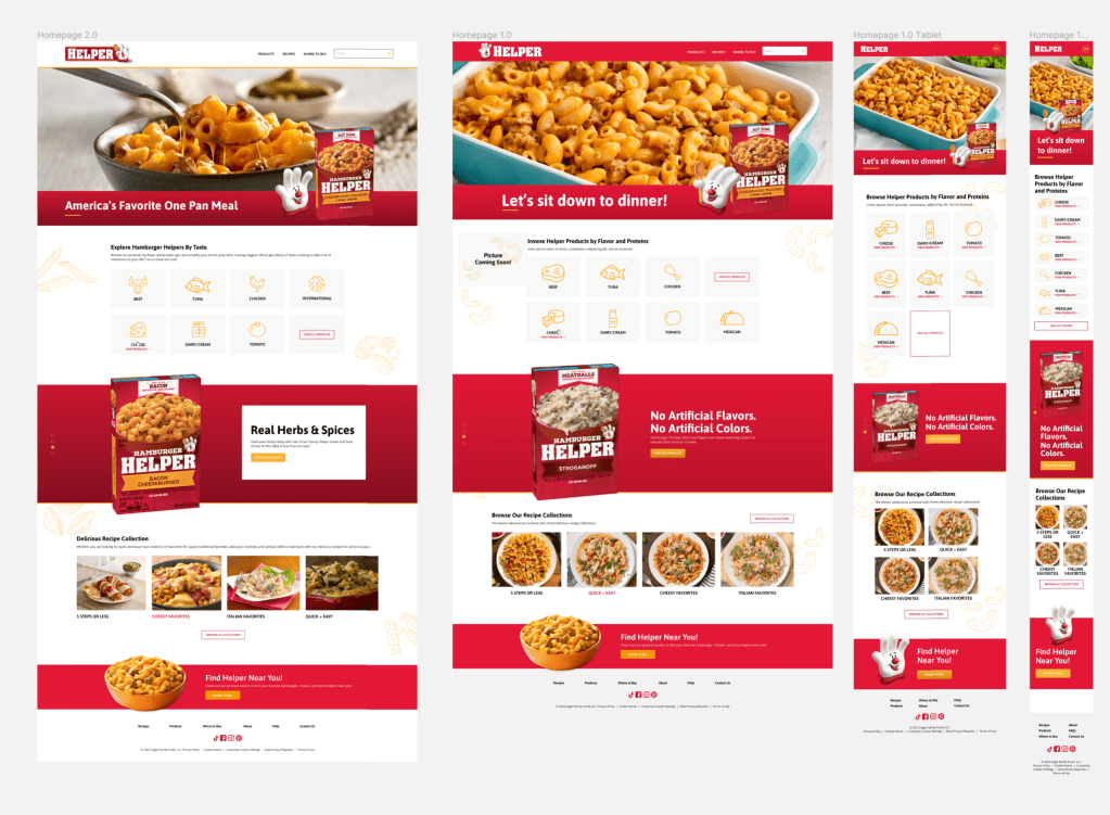 I advised organizing recipes by specific categories and collections, as well as prominently displaying keyword search boxes for quick results. Then, focus on the hierarchy of the information listed on each recipe page. Ingredients and instructions are the main content areas of focus. Use prep time, cook time, imagery, and share features as complementary additions. Create a website that offers users a quality experience across mobile and desktop platforms while maintaining the integrity of the design and brand experience of Hamburger Helper. This includes desktop, tablet, and mobile views, as well as the print view for recipes.