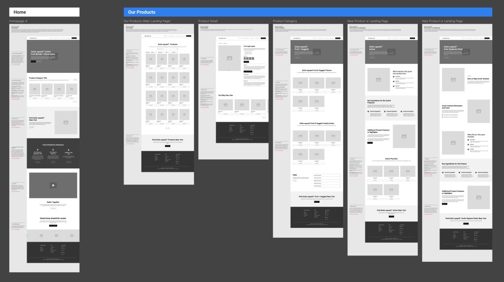 The plan focused on reorganizing product categories by needs and flavors and implementing prominent keyword search boxes for quick results. The content on each product-specific page was structured to prioritize ingredients, nutritional information, and key health benefits. Additionally, related product types were highlighted to keep users engaged. The goal was to create a website that offers a seamless experience across mobile and desktop platforms while maintaining the integrity of Gogo squeeZ’s design and brand experience.